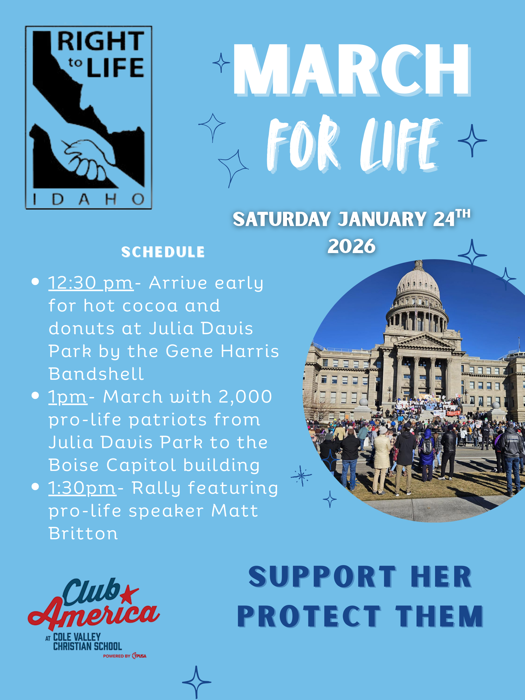 We will meet at Julia Davis Park by the Gene Harris Bandshell, then march to the Capitol building. Feel free to bring any pro-life posters. We will hear from some renowned pro-life speakers and legislators, This also counts as service hours!